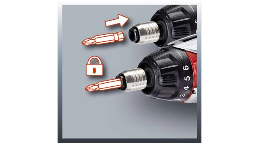 A csavarbehajtó bitek biztos rögzítése és gyors cseréje céljából a szerszám bit-reteszeléssel van ellátva.