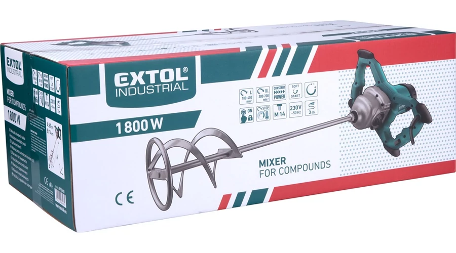 Extol Industrial elektromos festék- és habarcskeverő gép (mixer) 1800W, M14 menet, lágy indítás, ford I=180-400/min, II=300-700/min (8790600)